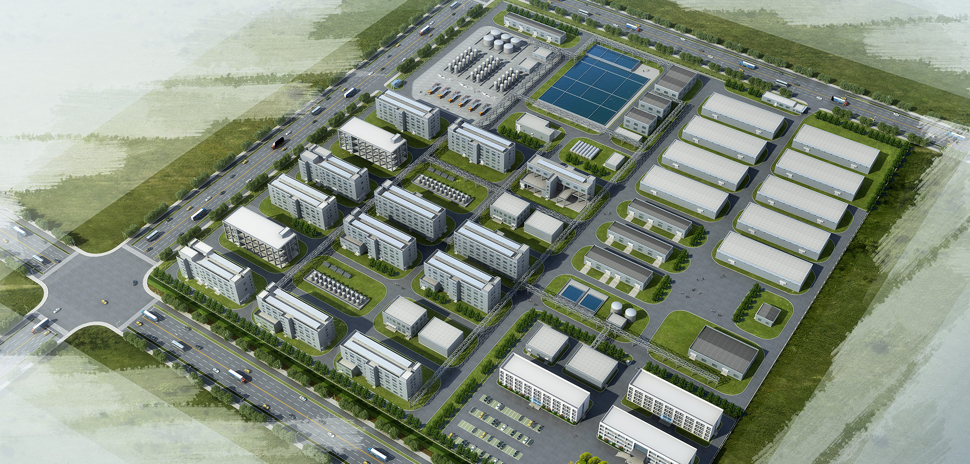 Construct areas such as product production center, environmental treatment center, warehouse management center, public engineering center, analysis and research center, etc